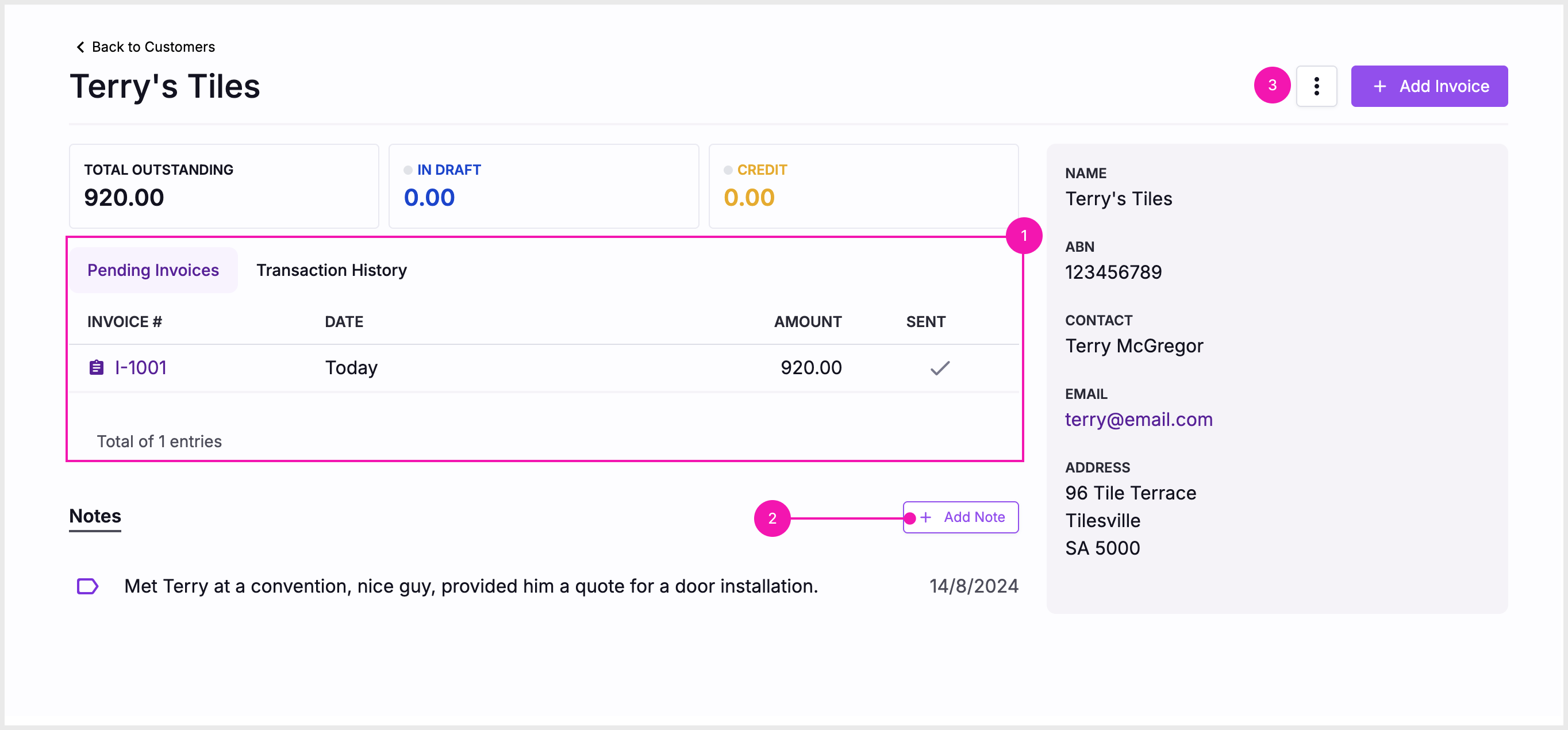 Use okke to keep and track your customers important details, including their contact details, notes, and more. Once you've added your customers, you can create and send them Quotes, Invoices, as well as view how much credit or debt they have with you.